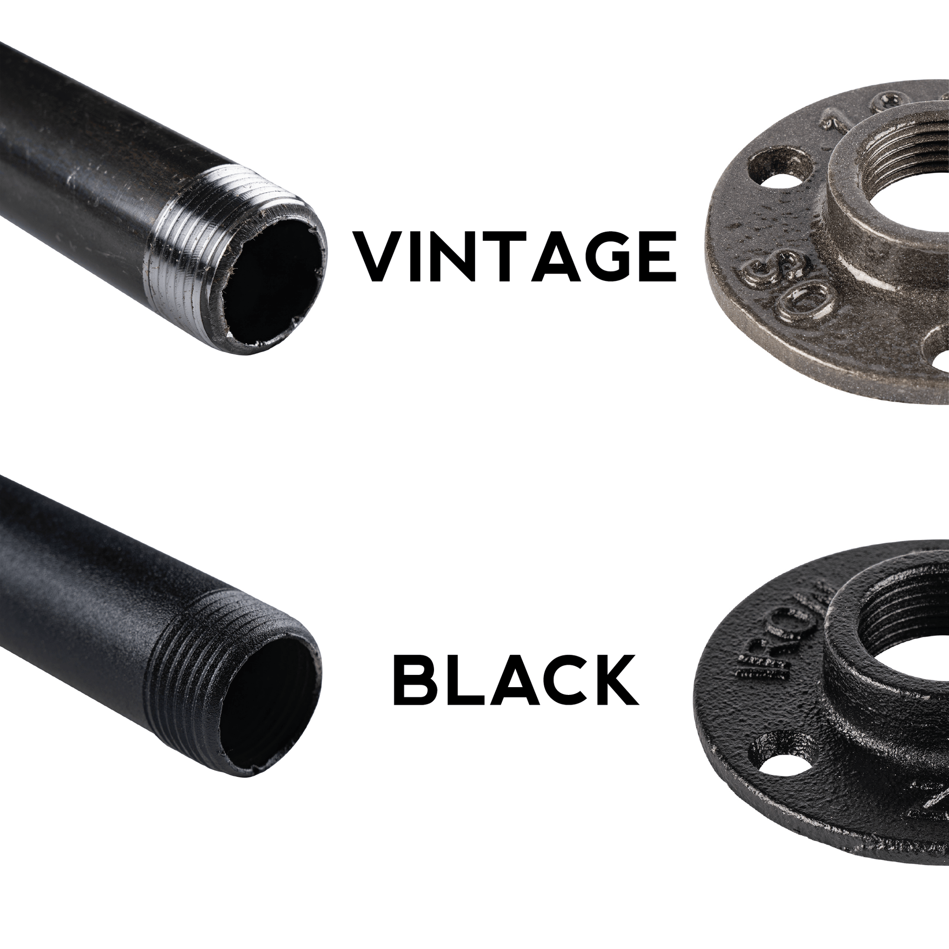 Vintage pipe is raw steel with a thin rust protection coating, however will patina over time. Fittings are raw iron with a gloss coating.